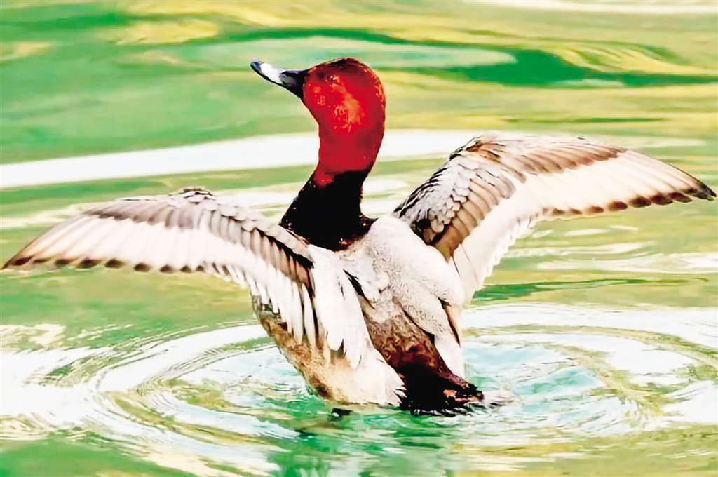 又名紅頭鴨,磯鳧。雄鳥頭部栗紅色,胸部黑色,背部及腹部灰白色,尾黑色,嘴藍灰色且端部黑色;雌鳥頭部及胸部暗褐色,背部及腹部灰色,尾部褐色,嘴基部色淺。紅頭潛鴨虹膜雄鳥紅色,雌鳥灰褐色,腳黑色。(來源:安康市林學會)FSQ安康新聞網