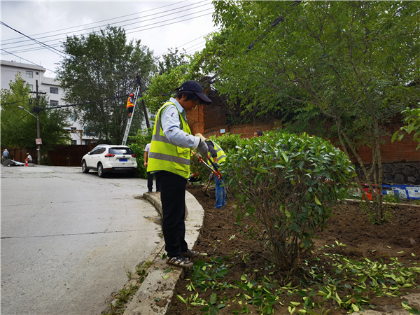 7月23日,前張嶺社區志愿者和高新綠化工人聯手整治群眾占用的街心花園。(陳小勇)