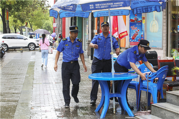 2022年7月19日,漢濱城管分局新城執法大隊的執法人員,冒著小到中雨,沿著巴山東路清理整頓占道經營和亂停亂放等不良行為。(李元武)