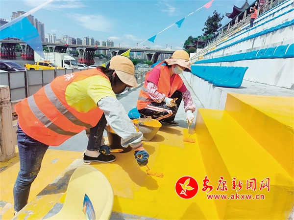 5月30日,工人們在第二十四屆安康漢江龍舟節主會場進行地面第二輪刷漆。據市市政園林處現場負責人介紹,截至目前,已搭建隔離護欄3715米,建立安檢門及疏散通道18個、蛇形通道8個,制作安裝導視牌10塊,對看臺區立面刷漆2629平方米,擦拭清洗并固定座椅3794個。錢運立 攝8wd安康新聞網