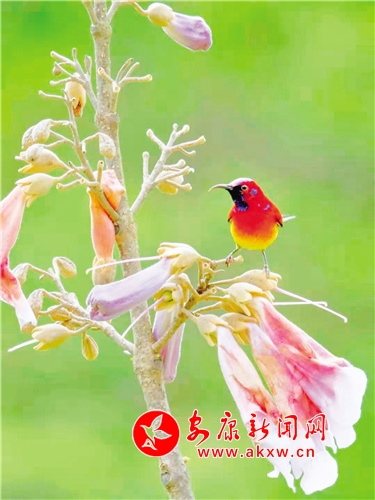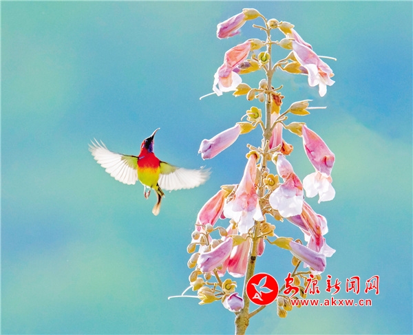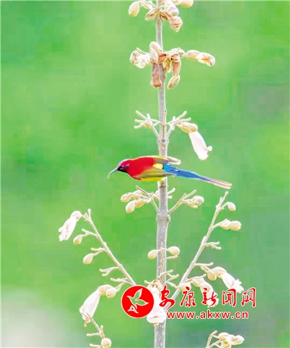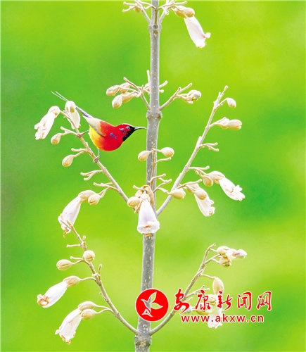 桐花鳳,是經(jīng)常出現(xiàn)在古代文人墨客筆下的吉祥鳥。但因很多人從未見過(guò)桐花鳳,遂將桐花鳳與綠毛幺鳳等混淆起來(lái)。經(jīng)今人翔實(shí)考證,才證實(shí)古“桐花鳳”就是現(xiàn)今的“太陽(yáng)鳥”。太陽(yáng)鳥象征著祥瑞、吉祥和諧、鳳凰齊飛、太陽(yáng)重升、身化火焰而使人間恢復(fù)光明。它還是熱愛(ài)光明、追求光明、獻(xiàn)身光明的象征。太陽(yáng)鳥也是太陽(yáng)崇拜和鳥崇拜相結(jié)合的產(chǎn)物。太陽(yáng)鳥世界共有14種,中國(guó)有6種,被譽(yù)為“東方的蜂鳥”“月下老人”,再加上太陽(yáng)鳥的寓意如此之好,太陽(yáng)鳥一直受到人們的喜愛(ài)與青睞。(圖文 張東風(fēng) )
