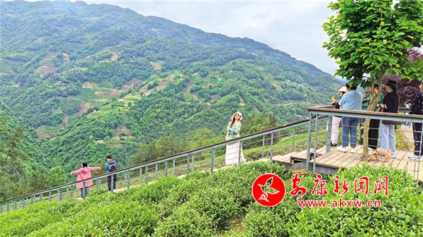 ① 游客在紫陽縣富硒茶觀光園里游玩拍照。儲茂銀 攝