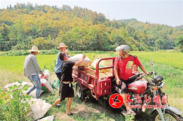 連日來,高溫天氣持續,漢濱區吉河鎮吉河壩社區大片水稻已經成熟,農戶搶抓晴好天氣開鐮收割,一派繁忙的豐收景象。該區40萬畝秋糧作物開鐮收獲以來,農業農村部門先后組織調運2000余臺(套)收割、脫粒等農機參與秋收工作。李勝福 攝