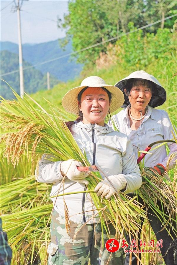 嵐皋縣南宮山鎮桂花村水稻喜迎豐收,今年預計稻谷產量達到45萬多公斤,帶動當地村民戶均年增收2000元。柴可庭 攝