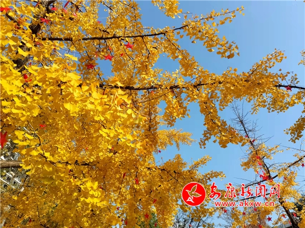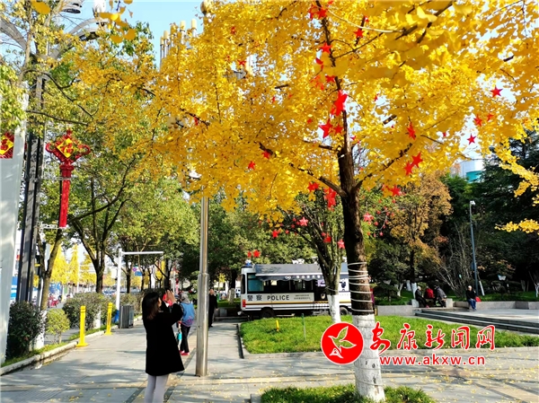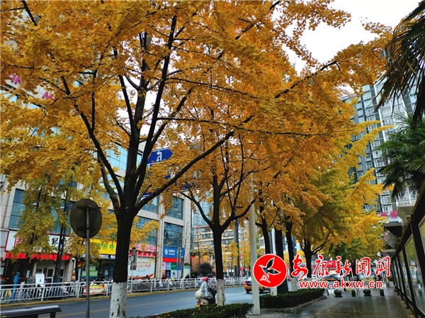 冬日暖陽,城區(qū)環(huán)城南路銀杏樹披上金色的盛裝。(陳榮斌 攝 )