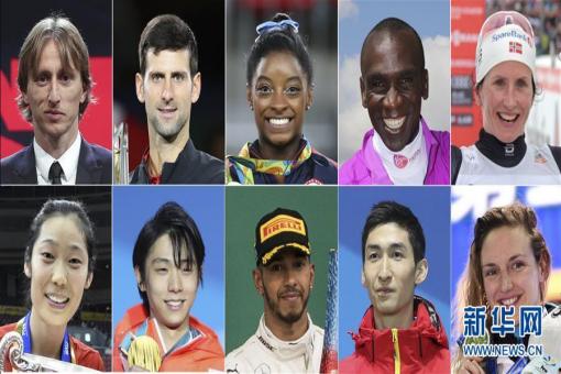 新華社體育部評出2018年國際十佳運動員。拼版照片上排從左至右為:盧卡·莫德里奇、諾瓦克·焦科維奇、西蒙·拜爾斯、埃魯德·基普喬格、比約根;下排從左至右……