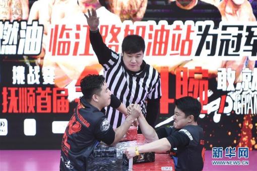 12月24日,兩名選手在進行腕力比賽。 當日,在遼寧省撫順市舉行了一場腕力大賽,100多位“掰腕子”愛好者參賽。 新華社記者姚劍鋒攝……