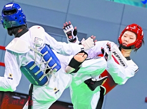 張夢(mèng)宇(右)在跆拳道女子67公斤級(jí)為廣東代表團(tuán)再添一金。新華社記者 郭晨 攝