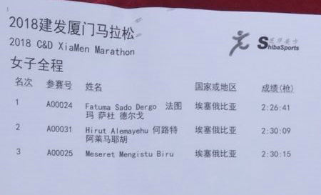 人民網廈門1月7日電(王月 張志強) 1月7日,2018年廈門馬拉松賽于早上7點30分鳴槍開跑,來自42個國家和地區的3萬余運動員參與。最終,來自埃塞爾比亞的德比拉以2小時11分22秒獲得男子組冠軍,同樣來自埃塞俄比亞的法圖瑪·薩杜以2小時26分41秒的成績獲得女子組冠軍。值得一提的是,本次廈門馬拉松男女前三名全部被埃塞俄比亞選手包攬。