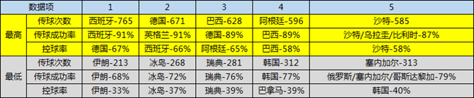而在控球方面,崇尚傳控打法的球隊顯然會占據控球率的前列,但控球不等于贏球,將“Tika-Taka”玩的最熟練的顯然是西班牙,他們不僅有著場均765次的驚人傳球次數以及場均91%的傳球成功率,并依靠著前鋒迭戈-科斯塔的優秀發揮,以小組第一順利出線;而與此形成鮮明對比的是一向以簡單、高效打法著稱的德國隊,居然也開始走上了“Tika-Taka”的路線,3場小組賽,德國擁有32支球隊最高的控球率67%(比西班牙的66%還高),同時居然也擁有場均671次的傳球次數和89%的傳球成功率,但遺憾的是勒夫的“無鋒”戰術,讓進攻的最后關頭啞了火。