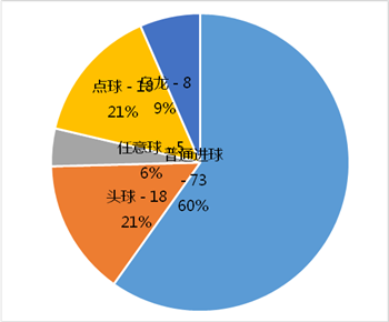 本屆世界杯關于進球的另一個感受就是點球的增加,由于VAR視頻助理裁判技術的引入,本屆世界杯小組賽共打進了18粒點球,而任意球直接破門也有5粒,均超過了上屆世界杯;而從進球方式來看,定位球(直接任意球和點球)的直接破門共有23粒,依靠定位球(任意球和角球)戰術打入的進球有27粒,而依靠運動戰打入的進球有72粒;