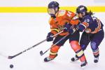 12月10日,深圳昆侖鴻星隊球員(左)和深圳萬科陽光隊球員在CWHL(加拿大女子冰球聯賽)常規賽比賽中拼搶……