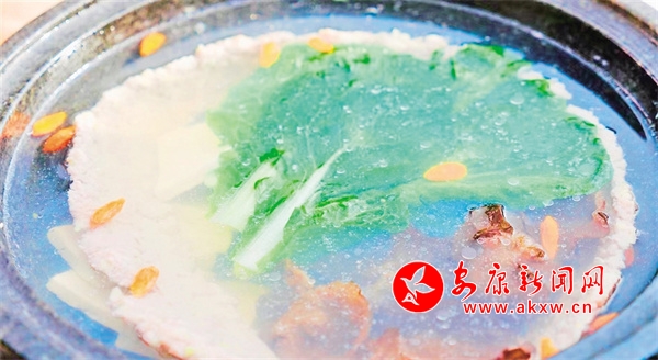 “白火石汆湯是我跟我祖父和父親學的手藝,13歲開始學做廚,白火石汆湯里面主要用到新鮮的豬肉,加蔥姜、蛋清、鹽、雞精以及料酒、生粉、蛋清,將其剁成肉泥,貼到陶盆里面,上厚下薄,里面陸續放上木耳、小青菜、豆腐,然后把石頭燒紅之后放進陶盆內的紗布中,只消幾分鐘,一道美味可口的白火石汆湯便做好了。”解遠平一邊準備食材,一邊向筆者介紹著白火石汆湯的做法。