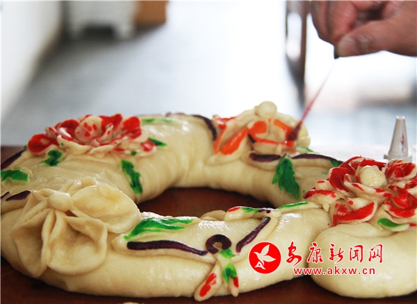 “做花饃先要做饃盤(基座),饃盤可大可小,一般有兩個(gè)饅頭大,然后將發(fā)酵好的面團(tuán)用手捏、用剪刀剪成各種花兒和鳥(niǎo)兒等圖案作為饃頂,如果面太軟,或者圖案太大,還需要用牙簽或者較大的竹枝從饃頂部插到饃盤上,以便固定不變形,最后放在籠屜上,蓋鍋后用大火蒸,待出鍋即成為造型生動(dòng)的花饃。最后再進(jìn)行上色,花饃形狀最多的是喜鵲、龍、鯉魚(yú)等,造型喜慶寓意吉祥。” 花饃技藝傳承人胡志霞說(shuō)道。