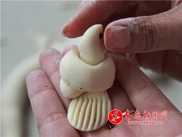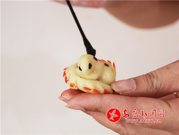 據(jù)了解,在安康本地常見(jiàn)的面塑有四種:第一種是生日滿月面塑,塑造成象征吉祥的植物、動(dòng)物及人物形象,如雙魚(yú)、項(xiàng)圈等寓意為健康、平安、一帆風(fēng)順等。第二種是祝壽面塑,多為壽糕、壽桃造型。以祝健康長(zhǎng)壽之意。第三種是喪葬祭祀面塑,用椌、塑、串各種手法蒸制成動(dòng)、植物造型,如:龍、鳳、花鳥(niǎo)魚(yú)蟲(chóng)等。施以紅黃綠重彩點(diǎn)染,稱為“供獻(xiàn)”,專用于亡靈的祭祀。第四種就是日常食用面塑,如油旋、麻花、點(diǎn)心、面角等。