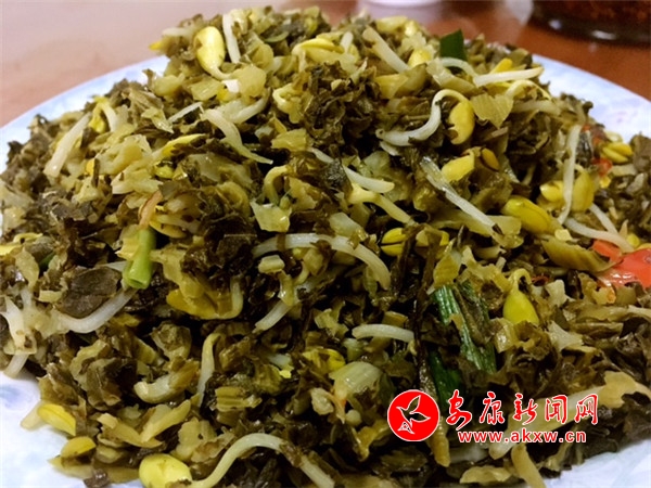 兩摻面摻好后醒的過程中,從酸菜壇子里撈出清亮的酸菜,配蒜瓣、姜末、蔥段、蒜苗、干辣子為佐料,韭菜、豆芽為輔料,一起下鍋炒熟,地道的安康酸菜出鍋,靜候與兩摻面的相逢。n2f安康新聞網