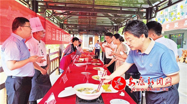 活動現場,壹品坊豆腐、王莽山莊、鄭家農家樂、胡桃里農莊、舒大嫂農家樂、方氏豆腐坊、財哥豆腐宴等10家農家樂帶來的37個美味的菜品一一呈上長條桌,供現場參與人員品鑒。