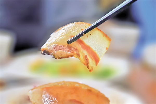 嵐皋臘味堪稱時間雕刻的藝術(shù),四季鎮(zhèn)的楊家院子里,當(dāng)?shù)孛考颐繎羧杂霉欧缰?ldquo;倒掛金鉤”。將土豬肉抹上花椒、橘子皮與苞谷酒,在巴山夜雨的潮潤與三冬暖陽的干燥間交替風(fēng)干三年。切片蒸熟的臘肉晶瑩剔透,肥瘦相間,咸香中暗藏果木幽香,入口爽嫩宜人,配以土灶新蒸的洋芋米飯,便是客路游子最深的鄉(xiāng)愁。小城的街頭同樣藏著流動的盛宴,冬日里挑擔(dān)叫賣的“烤紅薯”;北門坡老金家木槌現(xiàn)打的糯米飯團,在炭火上炙烤,待表面焦脆后填入芝麻糖餡;老菜市場樹蔭下的“漿巴饃”攤前,玉米漿發(fā)酵的酸香混著桐葉清香,勾住每個過路人的腳步。這些市井美味,構(gòu)成了嵐皋人記憶里的坐標(biāo)。