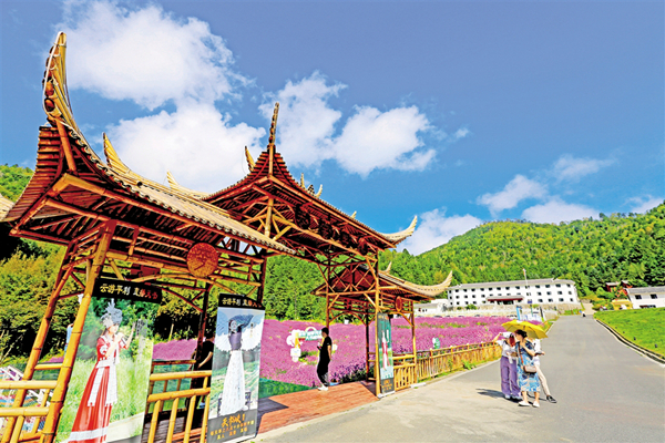 中秋節期間,平利千家坪森林公園天書峽馬鞭草花競相怒放。如畫的景色吸引眾多游客前來賞景打卡。(詹永桂 攝)7NW安康新聞網