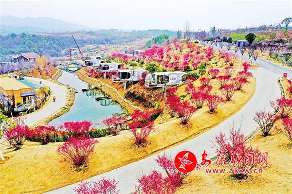 安康高新區桃花源,梅花與露營地星空房、湖溪亭榭相映成畫。詹永桂 攝