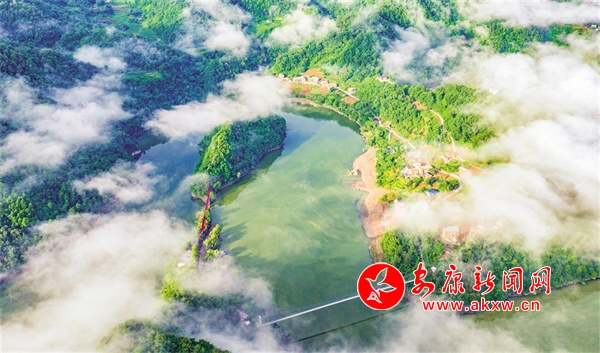 嵐水悠悠向北流,途經(jīng)那直插云霄的蠟燭山,夏季的晨曦中,山巒在云霧中若隱若現(xiàn),燭峰在天云里繞霧。一路向北,河流順勢(shì)拍打在蓬萊島上。這座小島如皎月抱星,由……